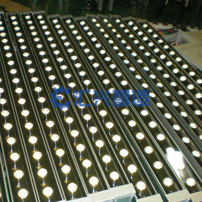 整燈裝配線主要是由輸送帶上料組裝和裝配機完成剪線、彎線、上鋁鉚釘、功率檢測、壓針、點膠、扣泡殼等工序,全線只需操作工人2名,半成品上料1名,可替代手工組裝6人的同等產能,工藝品質穩(wěn)定。整線造價經濟適用占地空間小,針對小批量的產品可選擇性使用部分自動化功能,整線留有自動化端口后續(xù)可升級如自動連接老化線。