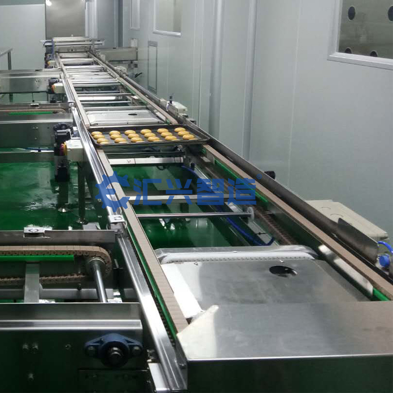組成:頂板鏈輸送機(jī)以標(biāo)準(zhǔn)頂板鏈為承載面,由馬達(dá)減速機(jī)為動(dòng)力傳動(dòng),運(yùn)行在專用導(dǎo)軌中,根據(jù)工藝流程不同,頂板鏈分為轉(zhuǎn)彎及直線型。