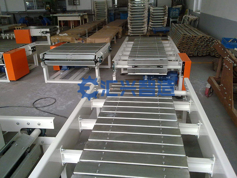 鏈板輸送線以標準鏈板為承載面,由馬達減速機為動力傳動;我們可以通過多列鏈板并行,使鏈板輸送線做的很寬并形成差速,利用多列鏈板的速度差使多列輸送在無擠壓的情況下變?yōu)閱瘟休斔停瑥亩鴿M足飲料貼標、灌裝、清洗等設(shè)備的單列輸送的要求,同樣也可以使單列變成多列并行走緩慢,從而產(chǎn)生儲存量,滿足殺菌機、儲瓶臺、冷瓶機的大量供料的要求,我們可以將兩條鏈板輸送線的頭尾部做成重疊式的混合鏈使得瓶(罐)體處于動態(tài)過度狀態(tài),使輸送線上不滯留物料,可以滿足空瓶以及實瓶壓力和無壓力輸送。