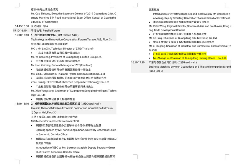 交流會上進(jìn)行粵港澳大灣區(qū)與泰國合作發(fā)展研討暨廣東省企業(yè)未來發(fā)展計(jì)劃介紹,廣東省商務(wù)廳副廳長陳越華先生作主持。廣東省發(fā)展與改革委員會主任、推進(jìn)粵港澳大灣區(qū)建設(shè)領(lǐng)導(dǎo)小組辦公室主任葛長偉先生帶來《共享粵港澳大灣區(qū)發(fā)展新機(jī)遇、推動廣東與泰國合作發(fā)展》的主題分享,珠海格力電器股份有限公司董事長董明珠女士、科大訊飛科大訊飛股份有限公司高級副總裁杜蘭女士介紹企業(yè)未來在泰國合作發(fā)展及投資計(jì)劃。交流會還進(jìn)行《粵港澳大灣區(qū)建設(shè)背景下粵港與泰國合作發(fā)展機(jī)遇》研討沙龍環(huán)節(jié),與泰國政商界代表共同探討促進(jìn)廣東和泰國雙方的交流與合作。
