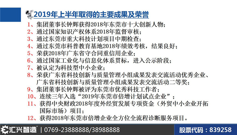 大會第五項議程知識產(chǎn)權(quán)部經(jīng)理蔣明華“年上半年取得的主要成果匯報”。實力見證榮耀,品質(zhì)鑄就輝煌。公司始終牢記“做受尊敬的好人、造受尊敬的產(chǎn)品、辦受尊敬的企業(yè)、建受尊敬的平臺”的企業(yè)使命,砥礪奮進,載譽而歸。這些榮譽既是對匯興智造年上半年成就的肯定,又是對未來發(fā)展的勉勵!
