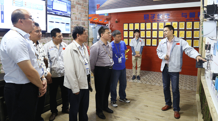 企業(yè)文化大使盧錦靚為李董一行講解生產(chǎn)車間智能目視化管理系統(tǒng)