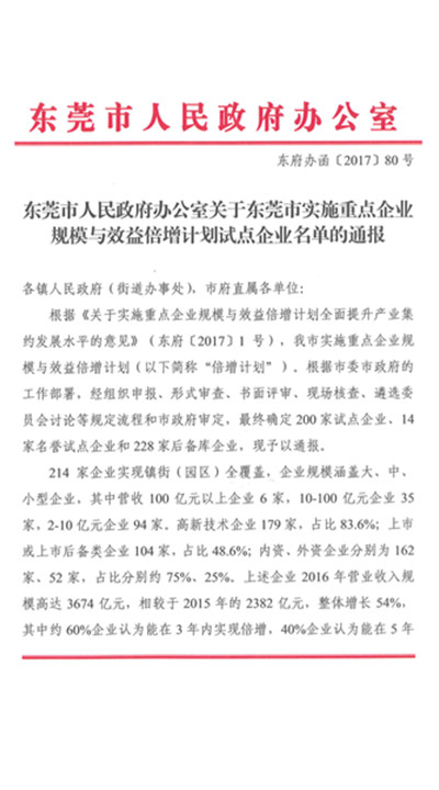 根據(jù)《關(guān)于實(shí)施重點(diǎn)企業(yè)規(guī)模與效益倍增計劃 全面提升產(chǎn)業(yè)集約發(fā)展水平的意見》(東府〔20171號),以及《關(guān)于東莞市實(shí)施重點(diǎn)企業(yè)規(guī)模與效益倍增計劃試點(diǎn)企業(yè)名單的通報》(東府辦函〔201780號),經(jīng)過前期的書面申報、形式審查、書面評審、現(xiàn)場核查、專家評審、材料審計等規(guī)定流程和市政府審定,廣東匯興精工智造股份有限公司(股票代碼:839258)憑借17年來在智能裝備領(lǐng)域的核心科技以及高成長性,成功入選為東莞市實(shí)施重點(diǎn)企業(yè)規(guī)模與效益倍增計劃(以下簡稱“倍增計劃”)200家試點(diǎn)企業(yè)之一。